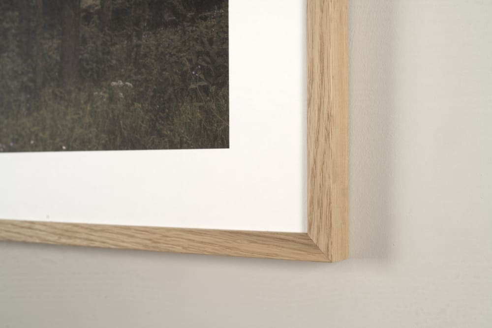 Marc de fusta de roure massissa procedent de boscos gestionats de manera sostenible. Sistema de tancament d’alta qualitat (possibilitat d’emmarcar sense cristall per evitar reflexos i gaudir plenament de l’obra i te la textura del paper).